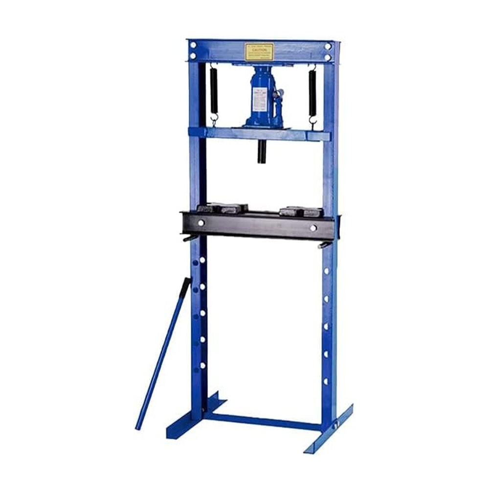 Manually raise and lower the table surface for the best working distance for the job; Equipped with a 12 ton (24,000 lb) capacity bottle jack with a working range from 0" to 24" Features high quality precision springs for slowly and safely bouncing back after pressing down operation; Piston-ram is treated and polished to resist skiving Treated with a powder-coated, lead-free paint, providing a durable coating which is oil, grease, and dirt-resistant for easy cleanup Heavy-duty steel H-frame hydraulic garage/shop floor press is designed for straightening, bending, pressing, and stamping Meets ASME PASE safety standards