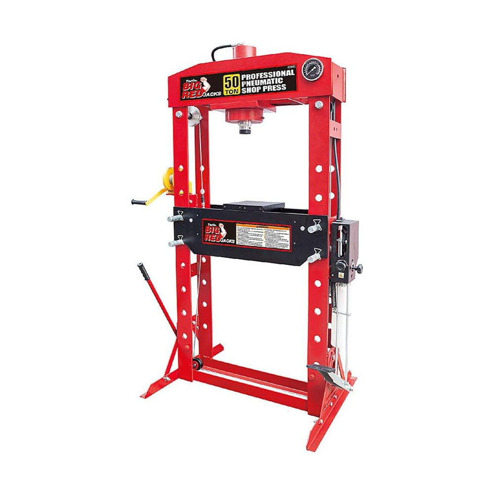 Material: Steel. Color: Red Durable hydraulic shop press with a 50 ton capacity Weight: 760.5lbs. Package Size: 78.7*45.9*16.8 inches The heavy-duty steel H-frame hydraulic garage/workshop floor press is designed for straightening, bending, pressing, and stamping; You can use it to remove and install bushings, bearings, ball joints, U-joints, pulleys, and gears Application: Hydraulic Shop Press are designed for automotive, truck, implement, fleet, and industrial repair shops where pressingbending , bending, straightening, forming ,holding required. Ideal for a small repair shop or home mechanic
