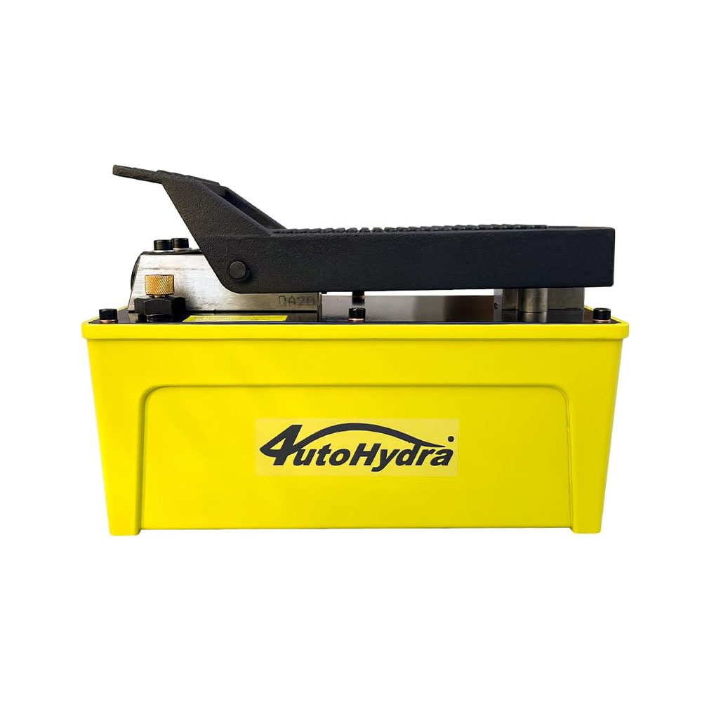 Foot-Actuated Design: The air hydraulic pump adopts a user-friendly foot-actuated design to provide hands-free operation for pumping and releasing the load, saving the operator's time and effort with strong power and high output pressure. The convenient 2-stage release mechanism gives fast or metered ram return while reducing hydraulic shock Sturdy & Compact Construction: This air hydraulic foot pump features an aviation aluminum pump core and a high-quality metal shell to handle tough industrial applications. 1.6L oil tank has a larger capacity with 98 cubic inches / 1.6 liters output oil. Built-in internal relief valve protects the hydraulic components regardless of hydraulic pressure Durable Oil Pipe: This hydraulic air pump is equipped with a 1 m /3 ft high-pressure oil pipe that features double protection of embedded steel wires and thickened outer layer. The oil port is made of cast steel, durable and reliable, no worry about the oil leak 10,000 PSI for Wide Application: This high-pressure hydraulic air-powered pump is designed to be used with single-acting cylinders only, efficiently operates many industrial and construction single-acting ram applications An ideal all-around power source and a great unit for use with a wide variety of rams, presses, and hydraulic pullers operating at up to 10,000 PSI