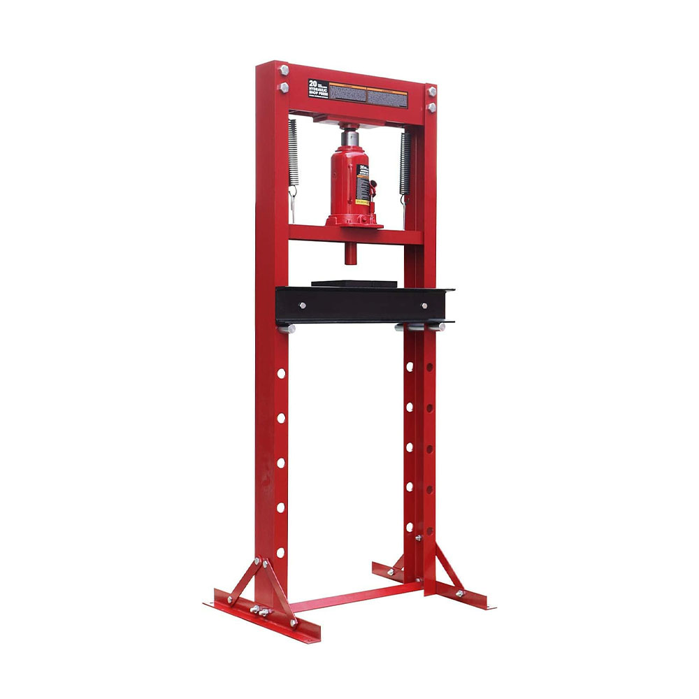 Manually raise and lower the table surface for the best working distance for the job; Equipped with a 20 ton (40, 000 lb) capacity bottle jack with a working range from 0" to 28" Features high quality precision springs for slowly and safely bouncing back after pressing down operation; Piston-ram is treated and polished to resist skiving Heavy-duty steel H-frame hydraulic garage/shop floor press is designed for straightening, bending, pressing, and stamping; Includes arbor press stamping plates that feature V-blocks and a 180-degree guide design Treated with a powder-coated, lead-free paint, providing a durable coating which is oil, grease, and dirt-resistant for easy cleanup Raise and lower the table for the best working distance for the job. Piston-ram is treated and polished to resist skiving
