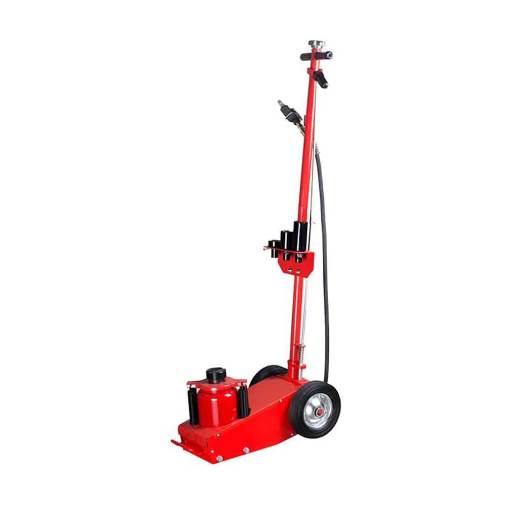 High Quality X-Large Rubber Tires - (2) large hard rubber tires on steel wheels, well absorb shock, resist wear and skid. Wheel diameter 8" Commercial Grade - Heavy Duty steel construction with sturdy handle and chrome plated ram, makes payload capability ups to 22 ton. Sprayed paint to resist rust & corrosion, adds extra durability. Suitable for home or business applications Performance You Can Count On - The long-wearing performance of this jack starts with the piston-ram. It's treated and polished to resist thinning over time and uses a Y-style polyurethane sealing ring with a backup ring Lengthened Handle - 46" long handle with air controls saves effort, makes it easy to position most vehicles. Adjustable angle from 90-180 degree. One handle operating setting, easy to use. One pull of the handle activates the self-retracting 22-ton capacity ram. Includes handle lock lever