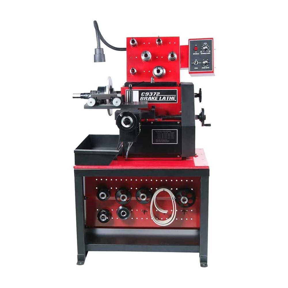 Effective & Essential piece of shop equipment: You can reduce or increase the cut-time for the best finish results, whether you're speeding through an initial rough cut or a single-pass micro-finish. This complete lathe package includes the lathe, a sturdy bench and a convenient top storage tray means your popular adapters and tools are kept within short reach Change from rotors to drums & back: A convenient quick-change tool-head design allows operators to quickly change the setup from drums to rotors and vice-versa. Upfront controls are designed for minimal operator movement. A handy tool tray is located near the front of the machine, so you can keep your favorite brake lathe tools nearby Designed to deliver perfect lathe results every time: The C9370 Series is equipped with features that help increase your service capability, like precision cutter tools and a quick drum-to-rotor changeover, positive rake cutter tip angle provides a one-pass finish virtually every time, allowing you to complete your work faster than inferior multi-pass lathes Exceptionally speedy & rugged: Maintains accuracy year after year thanks to ruggedly constructed components like a hardened, precision ground spindle that resists grooving. With the simple ergonomic controls are designed for minimal operator movement. Are essential to every garage or shop looking to perform brake service Fully equipped tooling package comes standard: Optional truck adapter kit available, with a variety of adapters let you machine all standard and composite rotors for foreign and domestic cars and light trucks. Includes boring bar, adapters, self-aligning spacer, centering cones, spacers, carbide cutting tools, 6-sided carbide cutting inserts, high-impact anti-vibration bands and plastic storage case