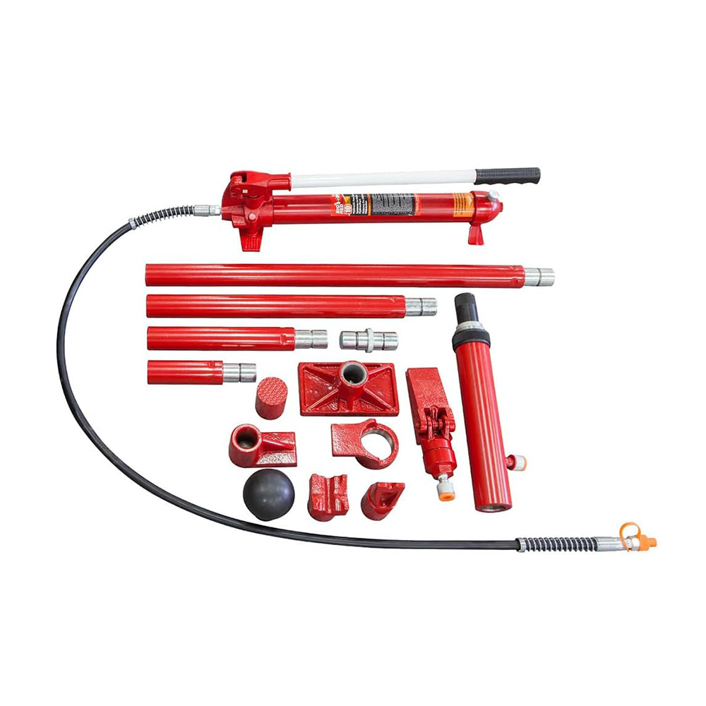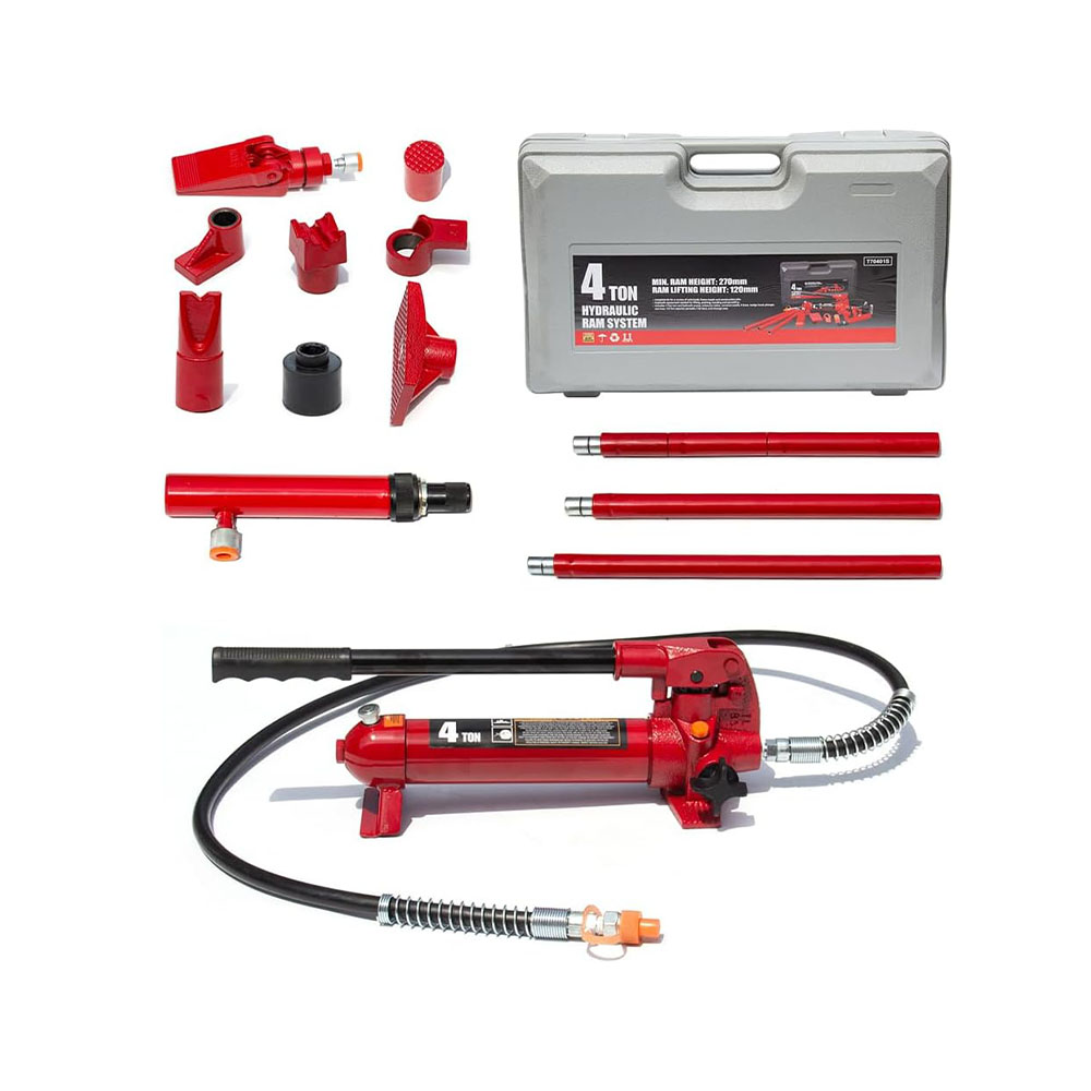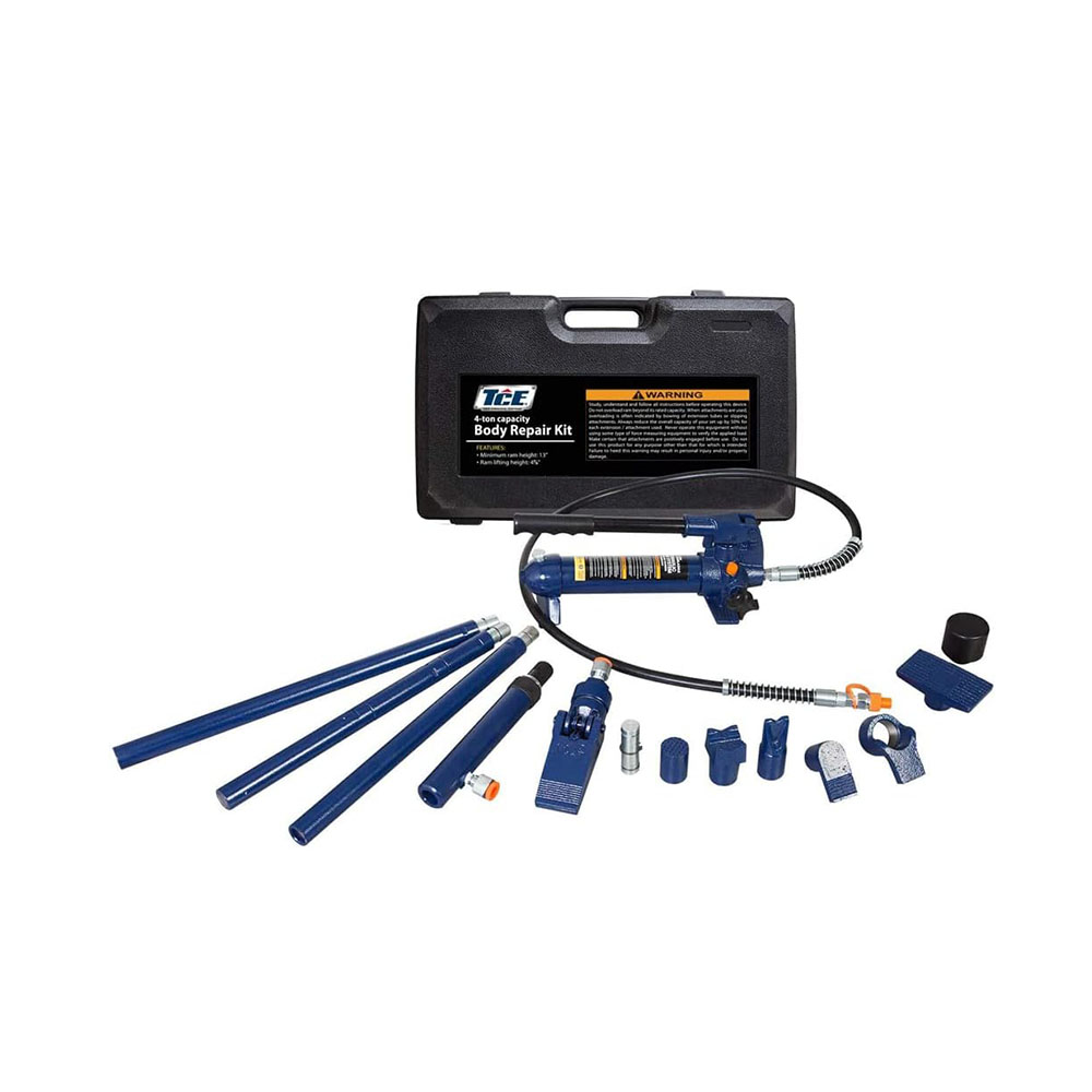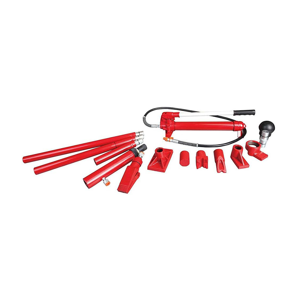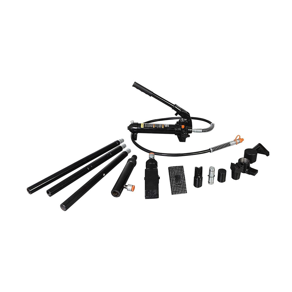 Complete kit includes a variety of auto body, frame repair and construction components for lifting, pushing, pulling, bending, straightening and spreading Features a serrated saddle, spread wedge, rubber head, flat base, ram toe, plunger toe, wedge head, V-base, male connector, and a hydraulic hose Ideal for your workshop or garage and has a 4 ton (8,000 lb) load capacity; Includes 20-7/8", 17-3/4", 9-3/4", 6-1/4", and 4-1/2" extension tubes with a snap-lock design for quick, easy assembly Plastic blow molded carrying case makes storage and transportation hassle-free; Meets ASME safety standards Pump has an automatic overload system to help prevent damage to rams and equipment; Flex head features a permanently molded rubber pad, interlocked to prevent separation