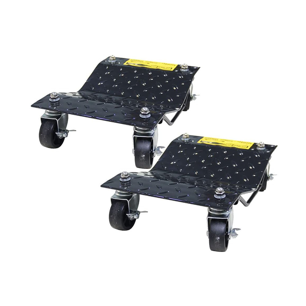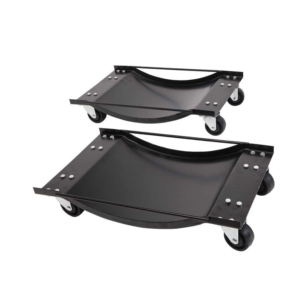The steel plate and 3-inch ball bearing locking casters of these sturdy wheel dollies set of 2 offer a 3000 lbs (1,500 lbs per skate) coverage for moving vehicles, lifting cars or trucks, or to position large loads for conserving space The ball bearing casters on each 4-wheel dolly allows you to rotate large items with wide-ranging 360-degree swivel for easy movement in any direction, making them ideal for auto repairs, car sales showrooms, or organizing the garage The snowmobile dolly set features a recessed center construction that is perfect for balancing and holding auto tires, ATVs, and other heavy equipment securely in place without fear of rolling The heavy-duty solid steel construction of these dollies with wheels ensures a durable and rust-resistant design, complete with a powder-coated platform for a classic finish Dimensions: (L) 16” x (W) 12”; Wheel Diameter: 3”. Weight Capacity: 3,000 lbs (1,500 lbs each). Set Contains 2 Car Dollies. Color: Black