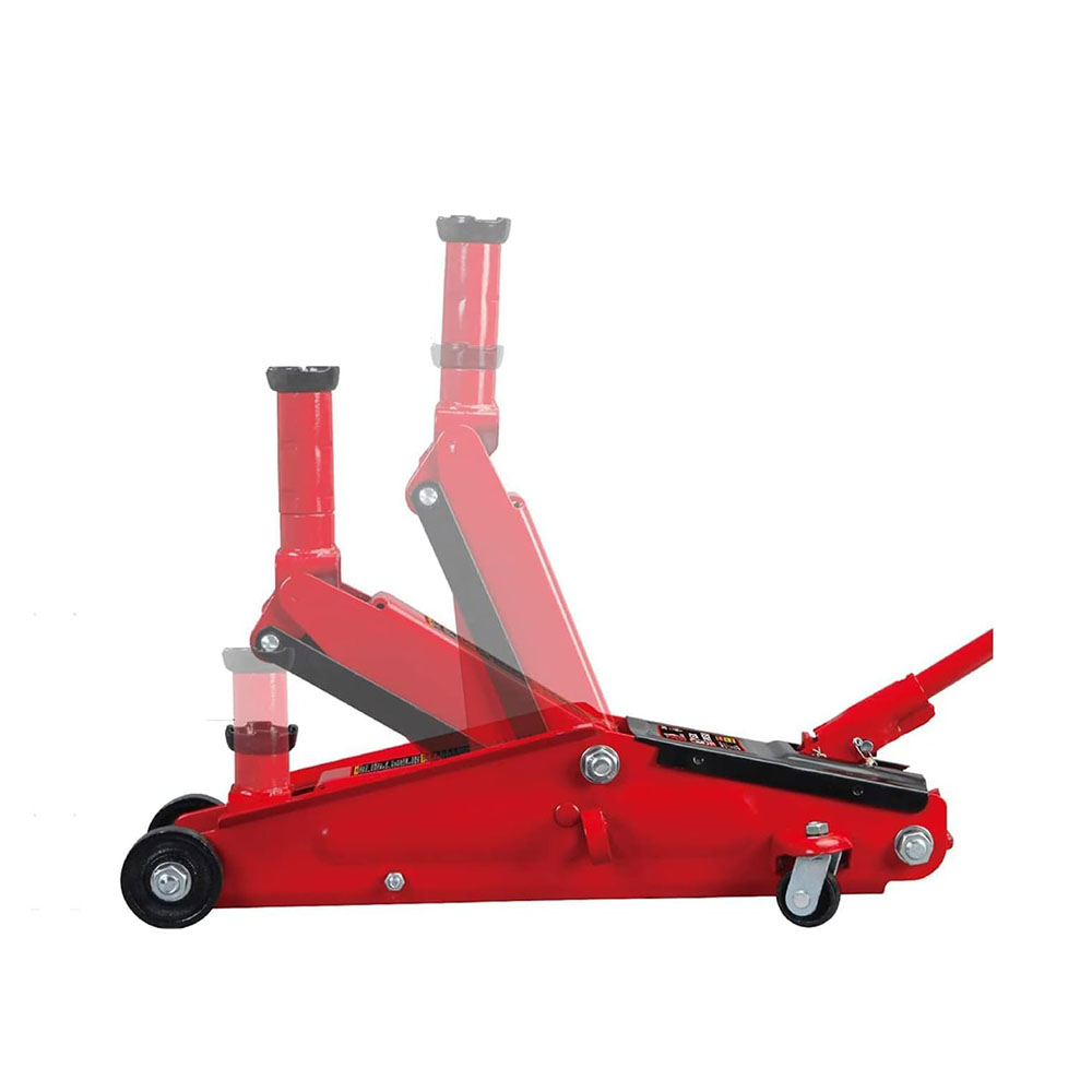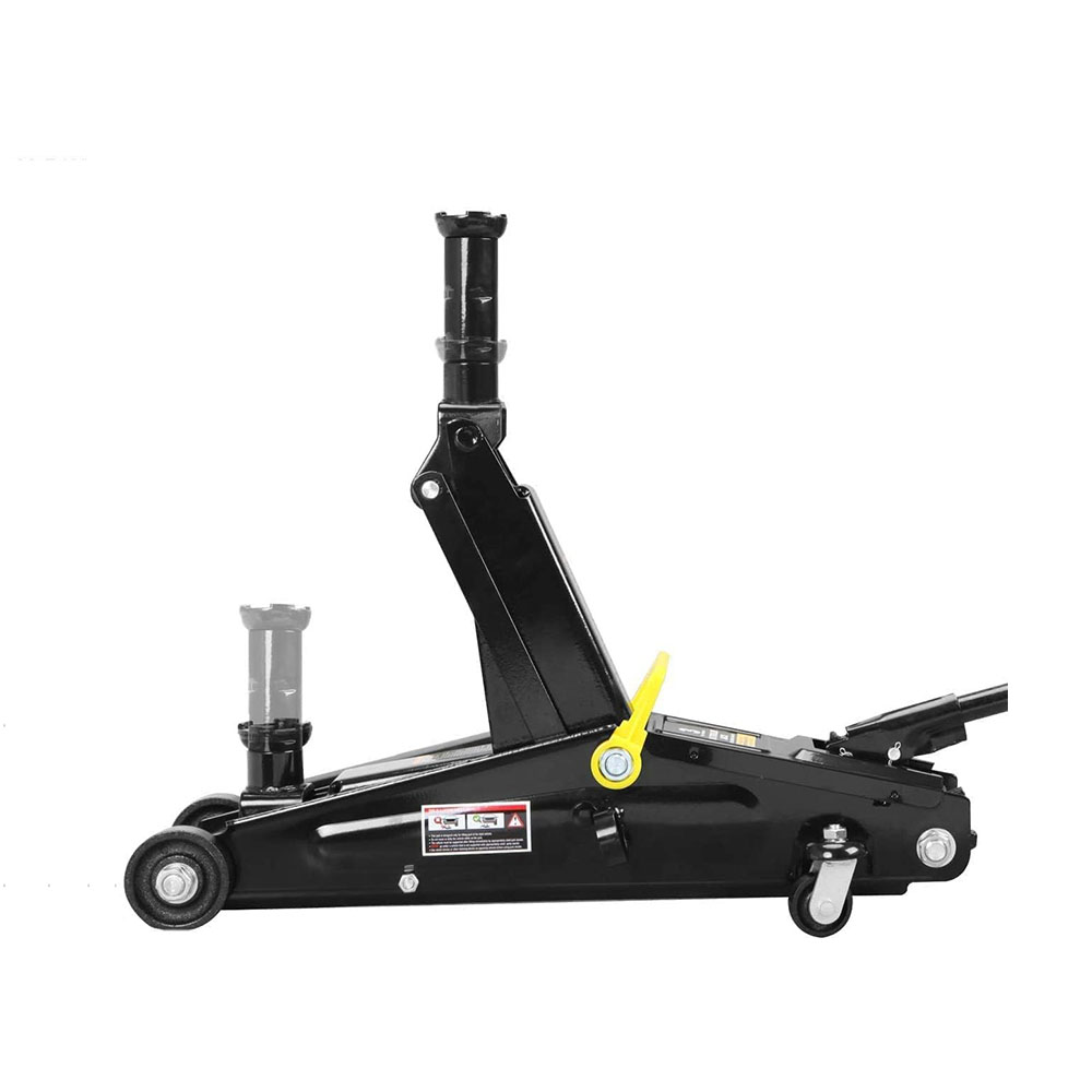 Features a 3 ton (6,000 lb) capacity with a minimum lifting height of 5-7/8" and a maximum height of 20-7/8"; Ideal for most cars, trucks, vans, and SUVs Hydraulic trolley floor jack is constructed with heavy duty steel, providing long term durability with an industrial luster Equipped with (2) large steel casters and (2) 360-degree swivel casters for smooth maneuverability; Extra long saddle neck saves time when lifting higher vehicles Single piston quick lift pump allows you to easily raise the jack to the desired height; Safety bypass system prevents over-loading and ensures safe operation Built-in carrying handle allows for the floor jack to be lifted and moved quickly; Includes a limited 1 year manufacturer warranty