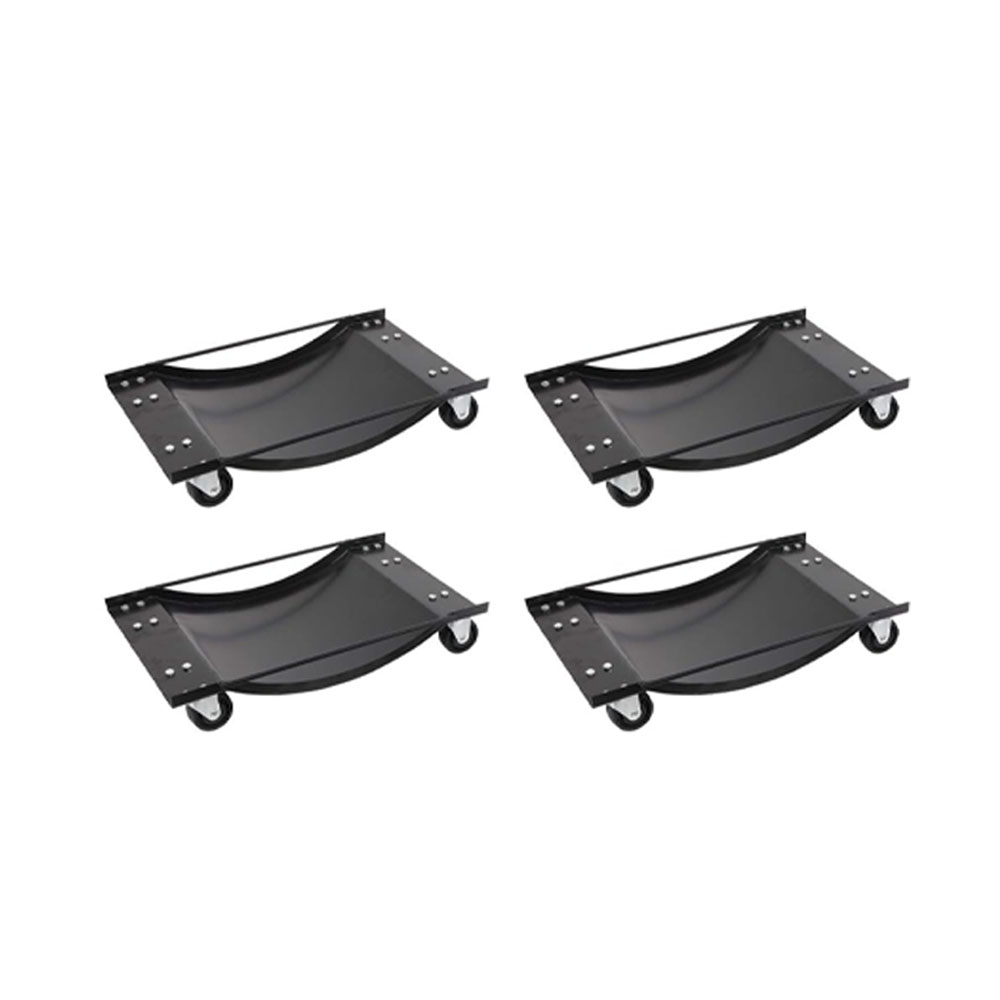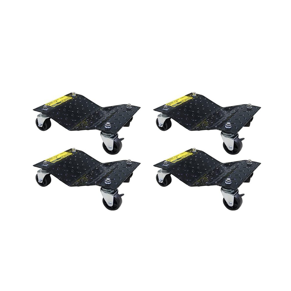 The steel plate and 3-inch ball bearing locking casters of these sturdy wheel dollies set of 4 offer a 6,000 lbs (1,500 lbs per skate) coverage for moving vehicles, lifting cars or trucks, or to position large loads for conserving space The ball bearing casters on each 4-wheel dolly allows you to rotate large items with wide-ranging 360-degree swivel for easy movement in any direction, making them ideal for auto repairs, car sales showrooms, or organizing the garage The snowmobile dolly set features a recessed center construction that is perfect for balancing and holding auto tires, ATVs, and other heavy equipment securely in place without fear of rolling The heavy-duty solid steel construction of these dollies with wheels ensures a durable and rust-resistant design, complete with a powder-coated platform for a classic finish Dimensions: (L) 16” x (W) 12”; Wheel Diameter: 3”. Weight Capacity: 6,000 lbs (1,500 lbs each). Set Contains 4 Car Dollies. Color: Black