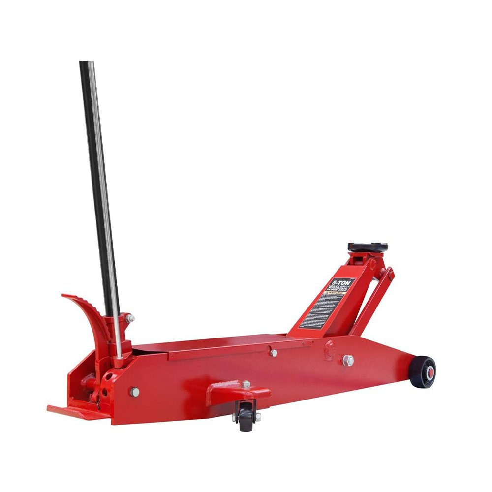 Features a 5 ton (10,000 lb) capacity and a lift range between 5-15/16" to 22"; Wide stance provides added stability under load Equipped with (2) large steel casters and (2) 360-degree swivel casters for smooth maneuverability Hydraulic floor jack is ideal for lifting heavy trucks, buses, agriculture and construction equipment Long frame extends past the overhang of commercial vehicles; Foot pedal control provides quick set-up and rise Features a built-in safety overload system prevents use beyond load capacity; Meets ASME PASE safety standards