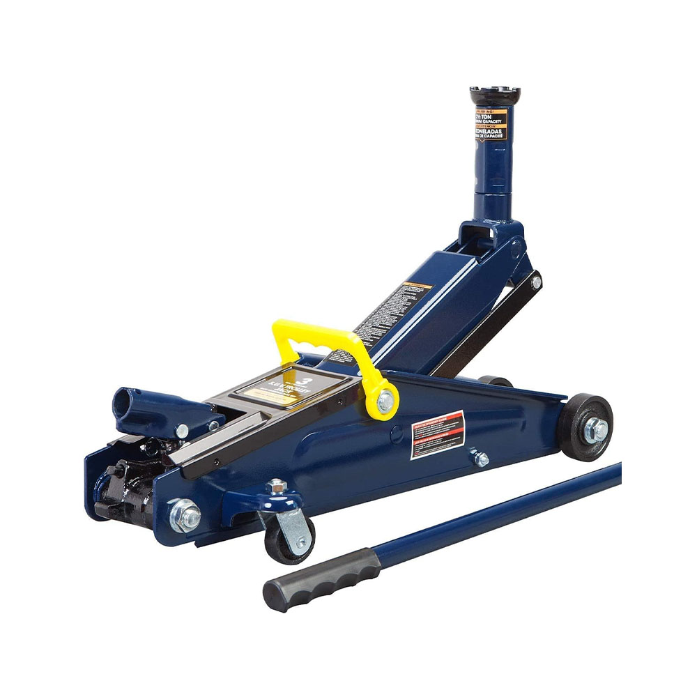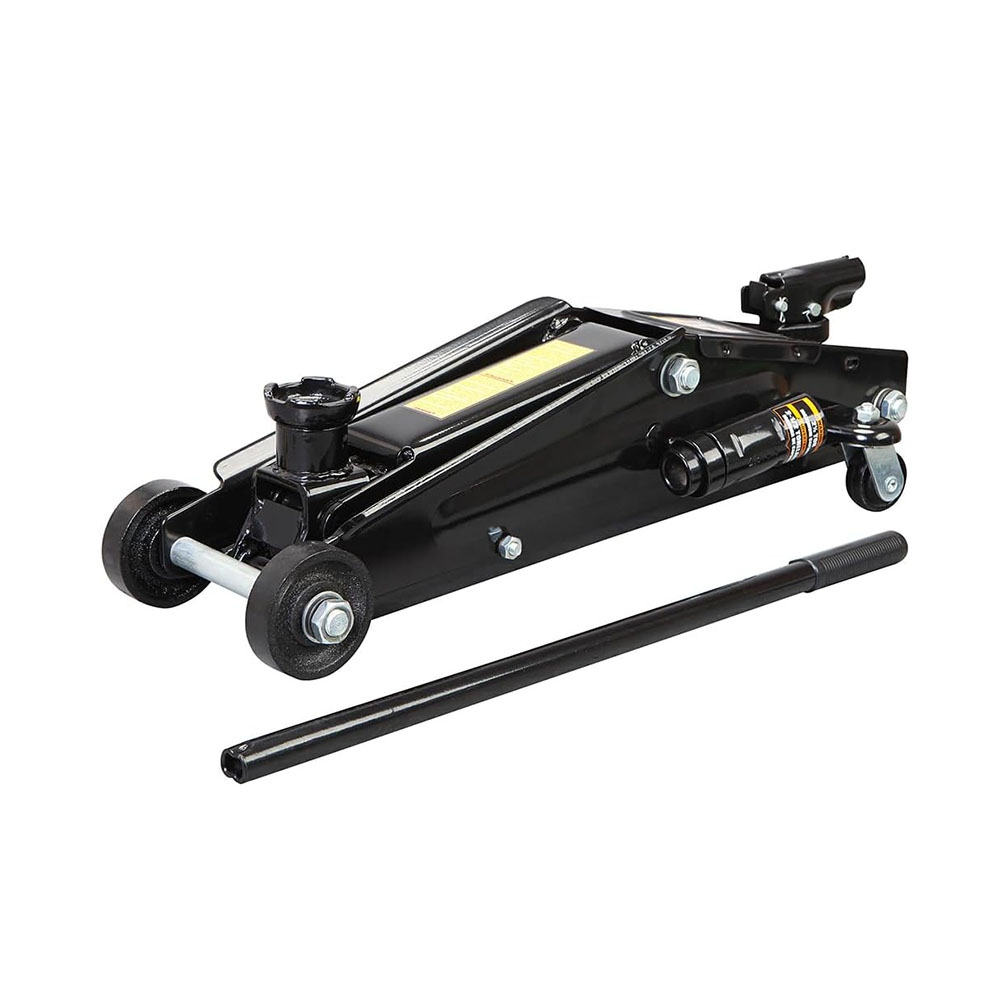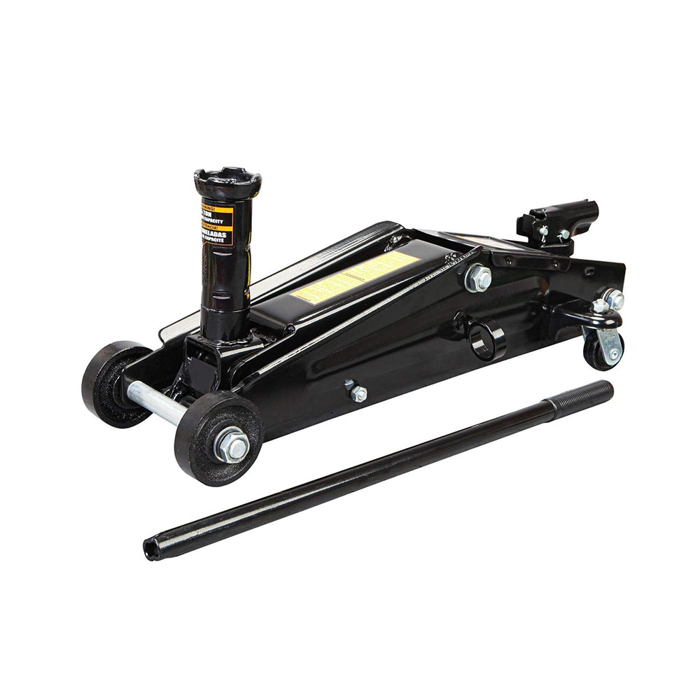 Ideal for most cars, trucks, and SUVs; Safety bypass system prevents over-loading and ensures safe operation Hydraulic trolley floor jack is constructed with heavy duty steel, providing long term durability with an industrial luster Equipped with (2) large steel casters and (2) 360-degree swivel casters for smooth maneuverability Features a 2.5 ton (5,000 lb) capacity with a minimum lifting height of 3-3/8" and a maximum height of 14-15/16" Built-in carrying handle allows for the jack to be lifted quickly; Includes a limited 1 year manufacturer warranty