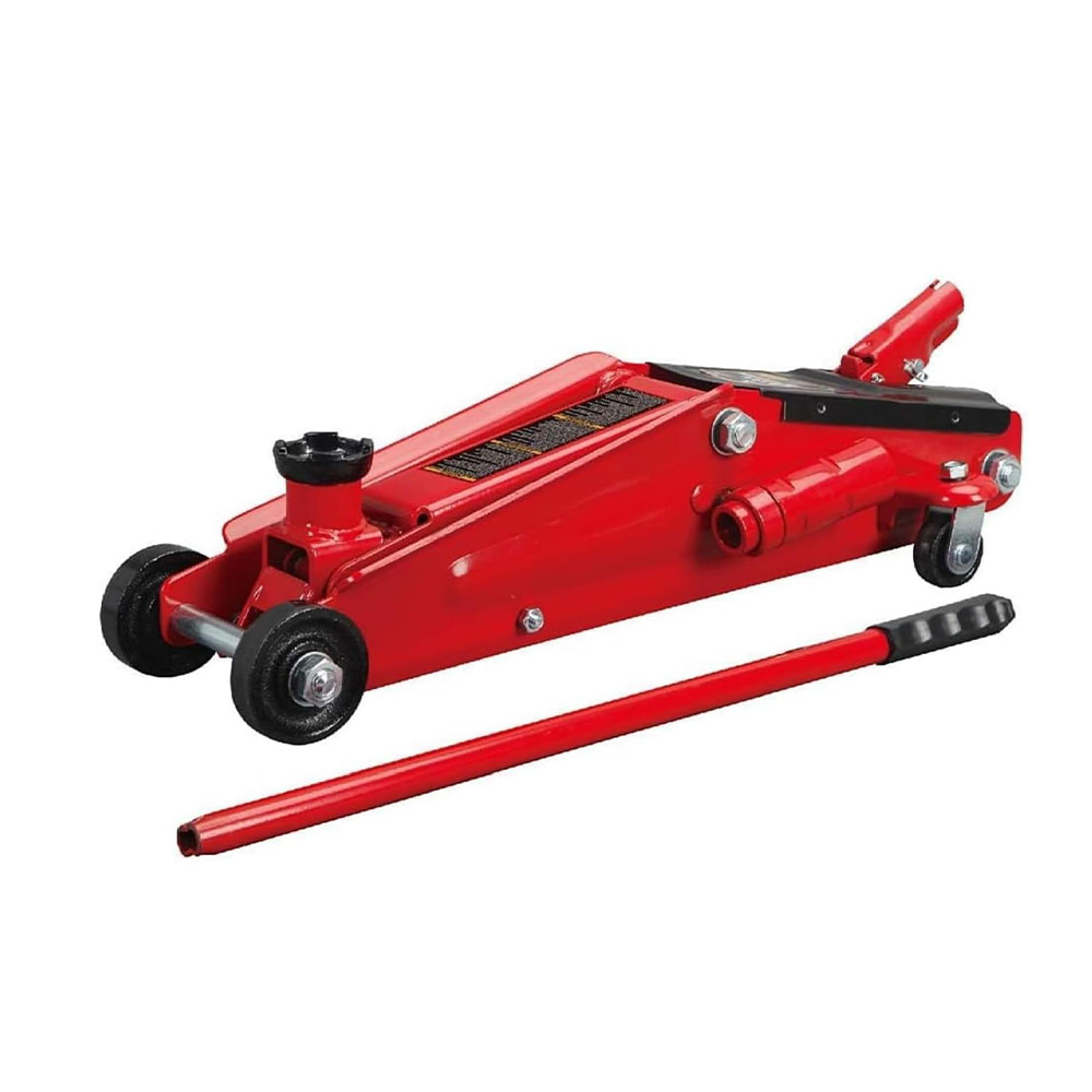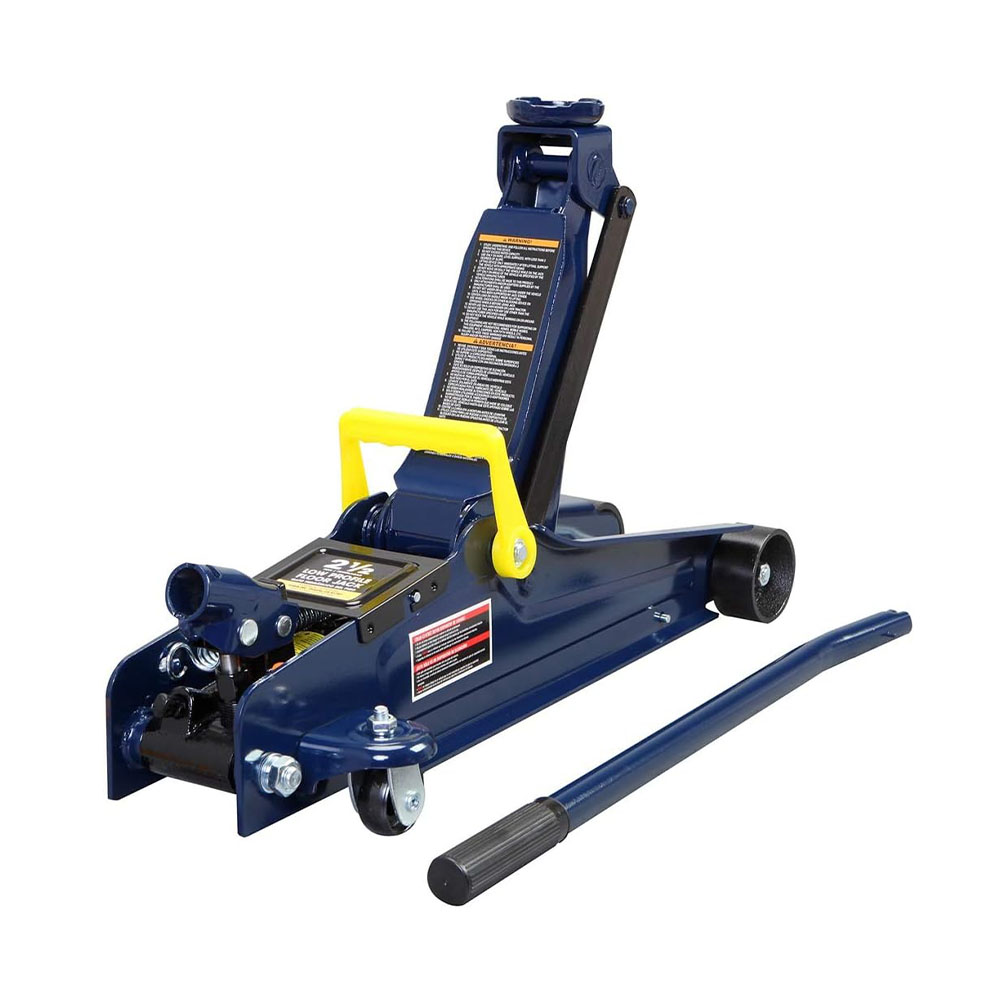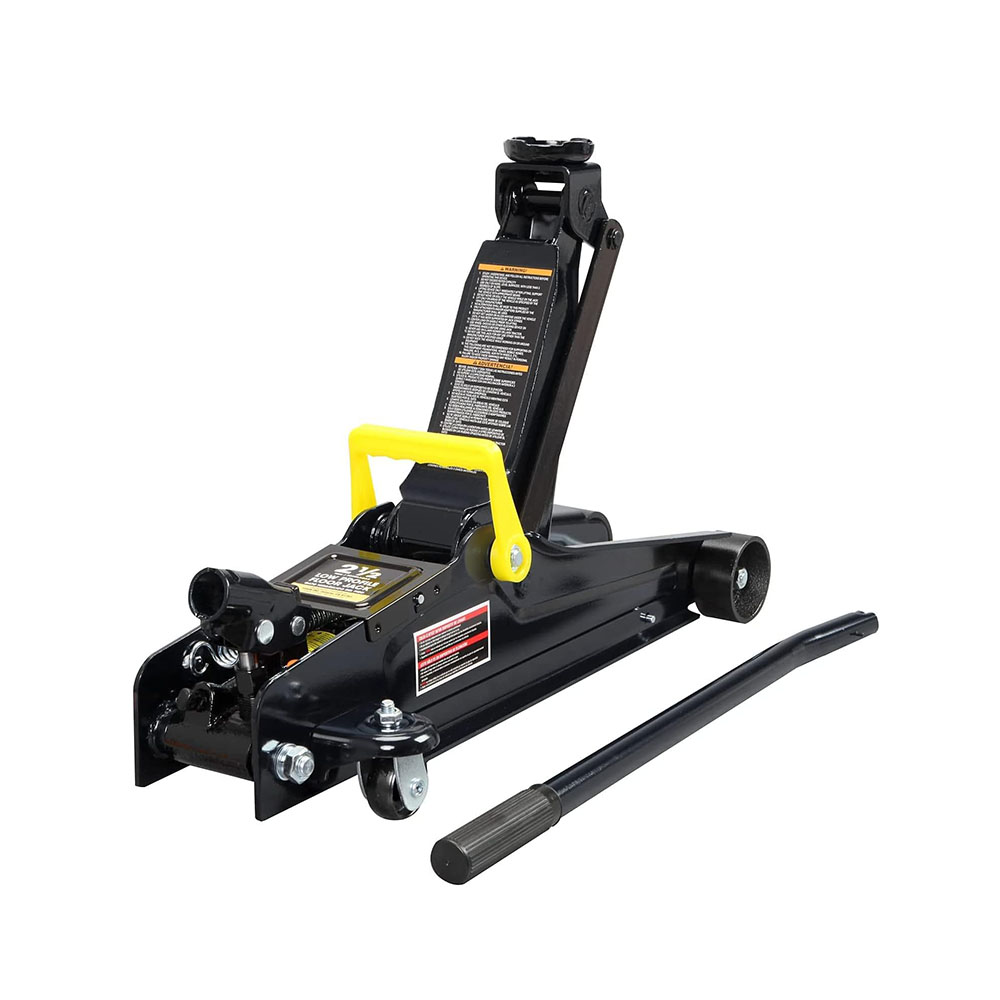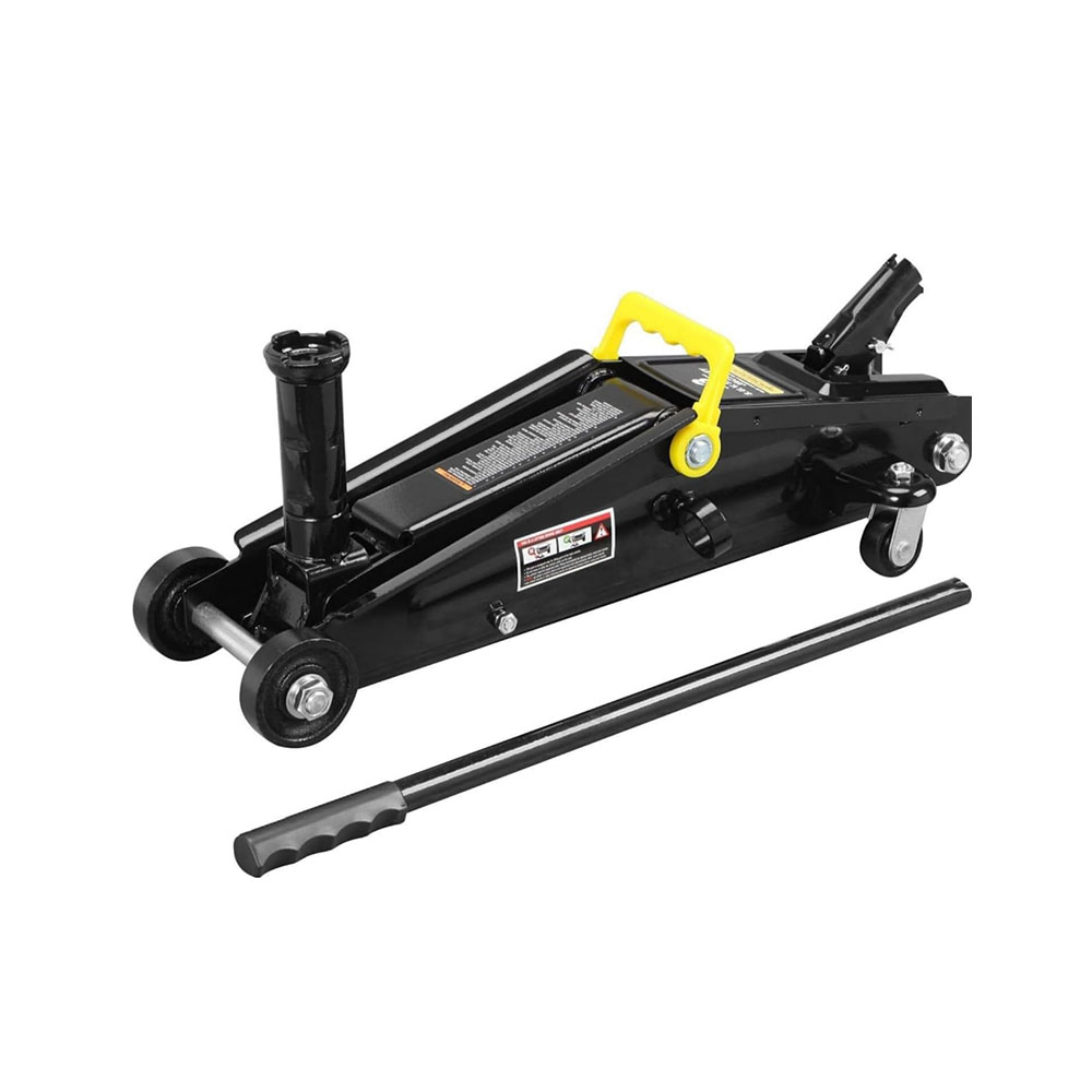 Ideal for most cars, trucks, and SUVs; Safety bypass system prevents over-loading and ensures safe operation Hydraulic trolley floor jack is constructed with heavy duty steel, providing long term durability with an industrial luster Equipped with (2) large steel casters and (2) 360-degree swivel casters for smooth maneuverability Features a 2.5 ton (5,000 lb) capacity with a minimum lifting height of 3-3/8" and a maximum height of 14-15/16" Built-in carrying handle allows for the jack to be lifted quickly; Includes a limited 1 year manufacturer warranty