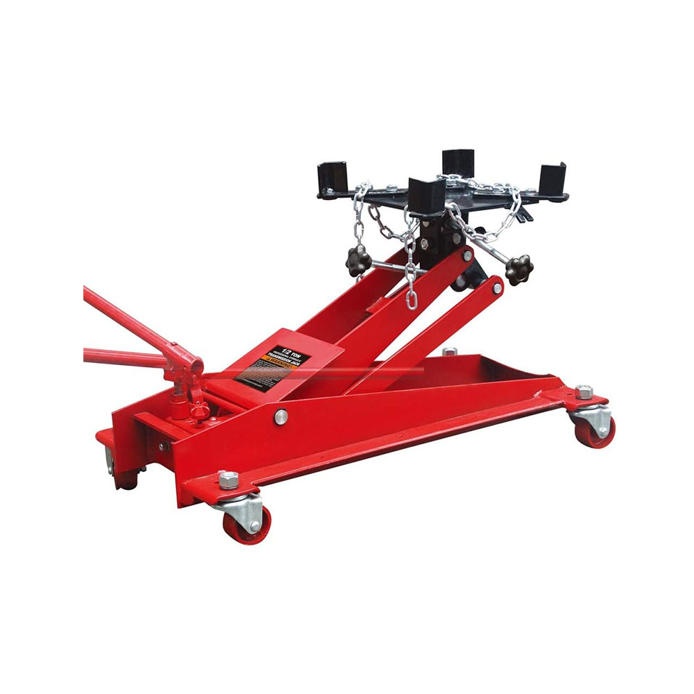 Lifting range from 8-11/16" to 22-11/16" and a 1/2 ton (1,000 lb) load capacity; Safety-overload system prevents use beyond its rated capacity Universal mounting head with a wide forward and aft tilt, making positioning effortless Transmission jack is ideal for everyday garage service as well as heavy-duty industrial use; Constructed of high-grade steel Features a 360-degree rotating handle and an adjustable head and saddle; Powder-coated finish prevents rust Equipped with (4) 360-degree swivel casters, delivering smooth and precise movements