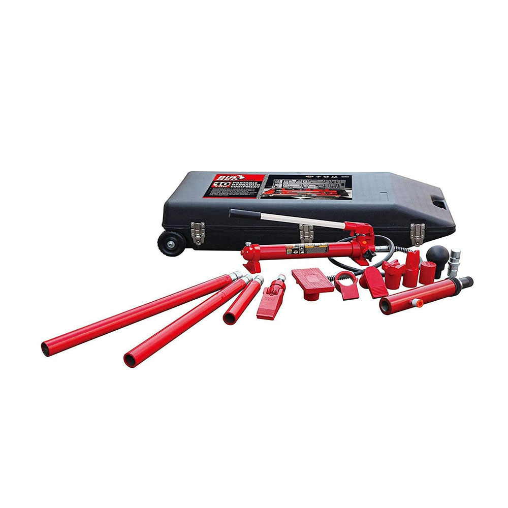 Ideal for your workshop or garage and has a 10 ton (20,000 lb) load capacity; Includes 29-1/4", 20-1/4", 12/1/4", and 7-1/4" extension tubes with a snap-lock design for quick, easy assembly Features a serrated saddle, spread wedge, rubber head, flat base, ram toe, plunger toe, wedge head, V-base, male connector, and a hydraulic hose. Complete kit includes a variety of auto body, frame repair and construction components for lifting, pushing, pulling, bending, straightening and spreading Pump has an automatic overload system to help prevent damage to rams and equipment; Flex head features a permanently molded rubber pad, interlocked to prevent separation Plastic blow molded rolling carrying case makes storage and transportation hassle-free; Meets ASME safety standards and includes a limited 1 year manufacturer warranty