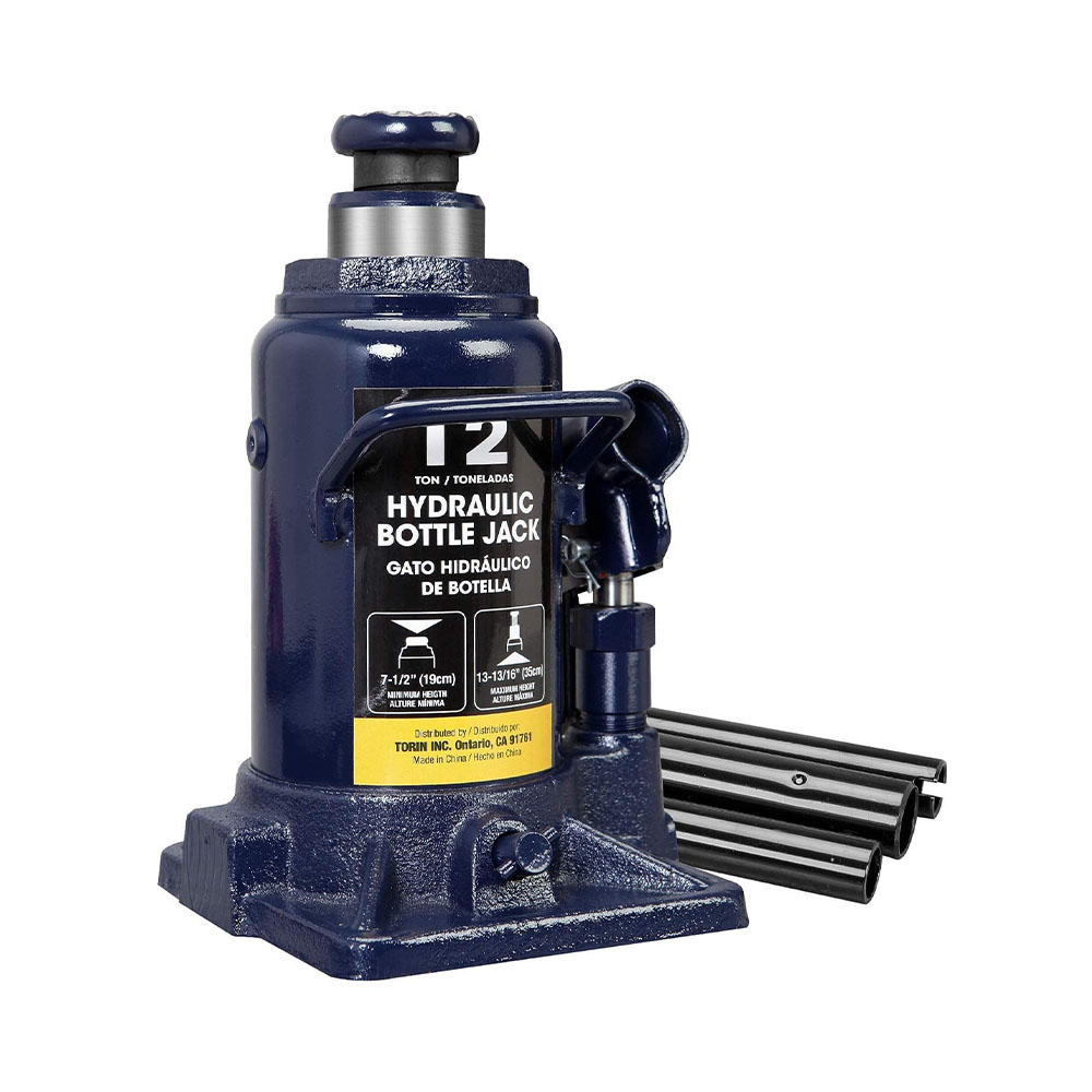Features a lifting range of 7-1/2" to 13-13/16" with a 12 ton (24,000 lb) capacity; Has a lifting height of 3-9/16" and an adjustable screw top extension that adds an additional height of 2-3/4" Hydraulic bottle jack designed for residential and commercial use that can be widely used for cars, trucks, and SUV's; Serrated, heat treated saddle provides generous lifting area and secure grip Glide-action pressure pump is designed to lift with minimal effort; Hydraulics are powered with a high-quality oil, which offers better corrosion resistance and high/low temperature flexibility Engineered using a drop forged alloyed steel construction for quality and durability Inner/outer welded structure delivers leak-free performance and has a longer operation life and an overall stronger build