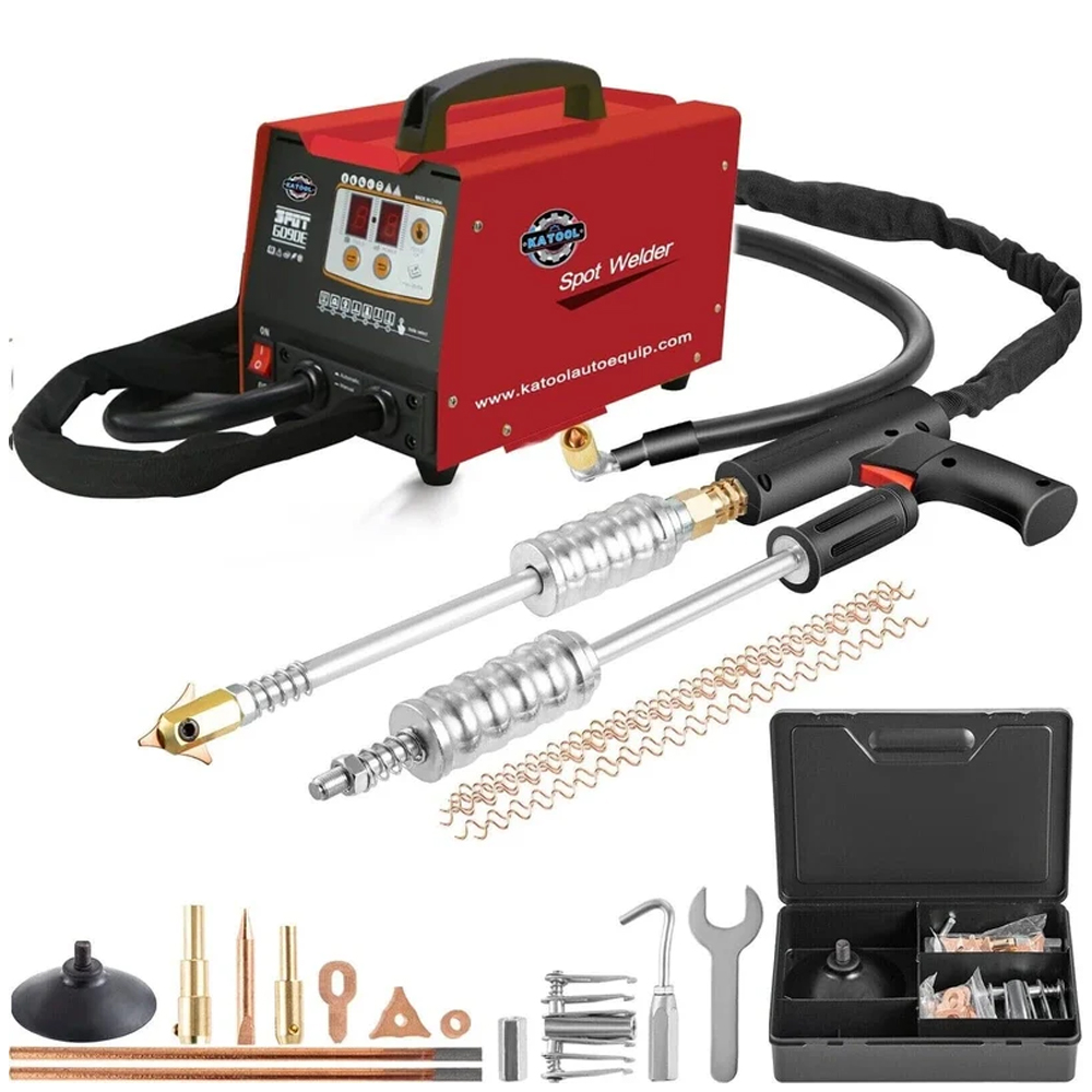 The Katool PRO Body Spot Welder Dent Puller is a game-changer in small-scale spot welding. Engineered with precision, this dent puller minimizes damage to rust-proof paint on panel surfaces, making it an invaluable tool for both professionals and novices. Equipped with a dent puller and welding gun, it seamlessly performs dual functions with different standard accessories, enhancing efficiency and saving valuable time during operations. The spot welder's fast heat radiation, aided by side holes and automatic overheating protection, ensures prolonged, worry-free use. Versatile in application, it serves as an ideal solution for automobile repair, encompassing dent forming, sheet metal repair, and various other bodywork repairs.