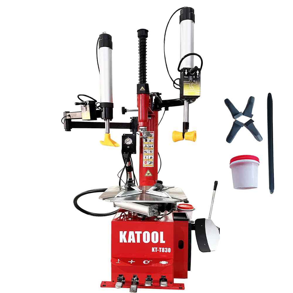 The Katool KT-T835 Wheel Clamp Tire Changer is crafted with a sturdy alloy steel jaw and a stainless mounting head for maximum toughness. Its pedal-controlled air gauge, spade cover, and user-friendly pedal system ensure a smooth tire-changing experience. Equipped with a top-level motor and quality filter for durability and efficiency. Tailored for North America, it boasts a robust 110V motor, double side assist arm, and a stainless bead breaker cylinder. All housed in a closed body for ultimate part protection.